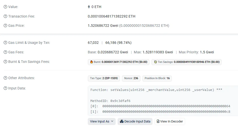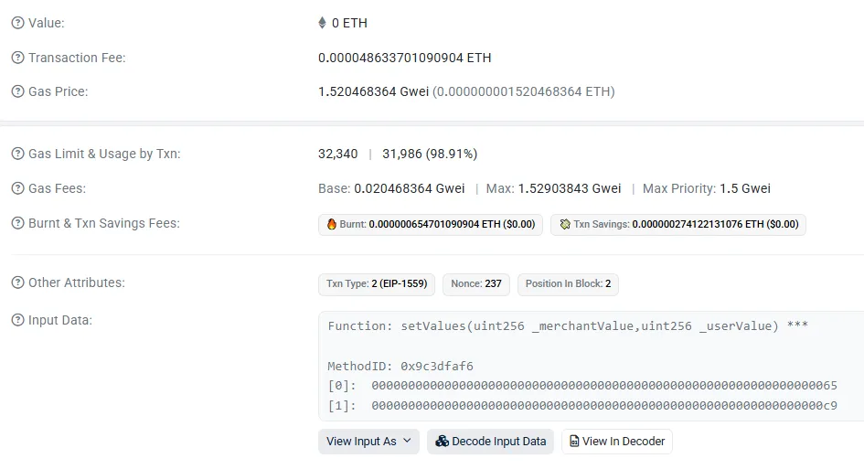和前两笔 setValues 一样:价格几乎没变,差异全部来自 Gas Used。